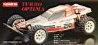 The Kyosho Turbo Optima was a follow up to the very successful four-wheel drive racer the Optima. Released in the summer 1986 the turbo version improved some of the design aspects of the original. The most obvious change was a purely cosmetic one, a redesigned lexan body. This was to quell the need for a rear wing that some felt was missing from the original, Kyosho had also dropped the driver doll. Quite a number of performance improvements were also made, these include; larger dampers with a better seal and collar design, front and rear sway bars, relocated heat sink, fully ball raced, aluminum full length skid plate, larger tires "Bridgestone Sand Super", eight whole two piece rims and the LeMans 240s motor.